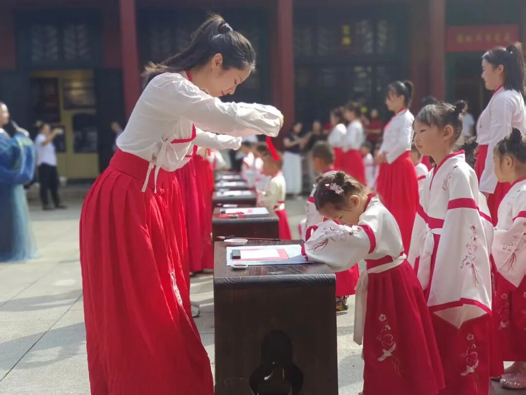 浠水文庙以一场典礼,将地域文脉(闻一多故乡的文教传统)、国家正典(释菜礼制)与个体成长(开笔启蒙)巧妙衔接,使传统文化成为可感、可触、可承的活态传承。朱砂一点,开笔一字,非为造就神童,而在播种文化自信。当学童们带着眉间的朱砂印走出文庙时,他们携走的不仅是知识火种,更是一个民族向历史致敬、向未来开笔的文明宣言。(通讯员:胡静 万丹 朱一慧)