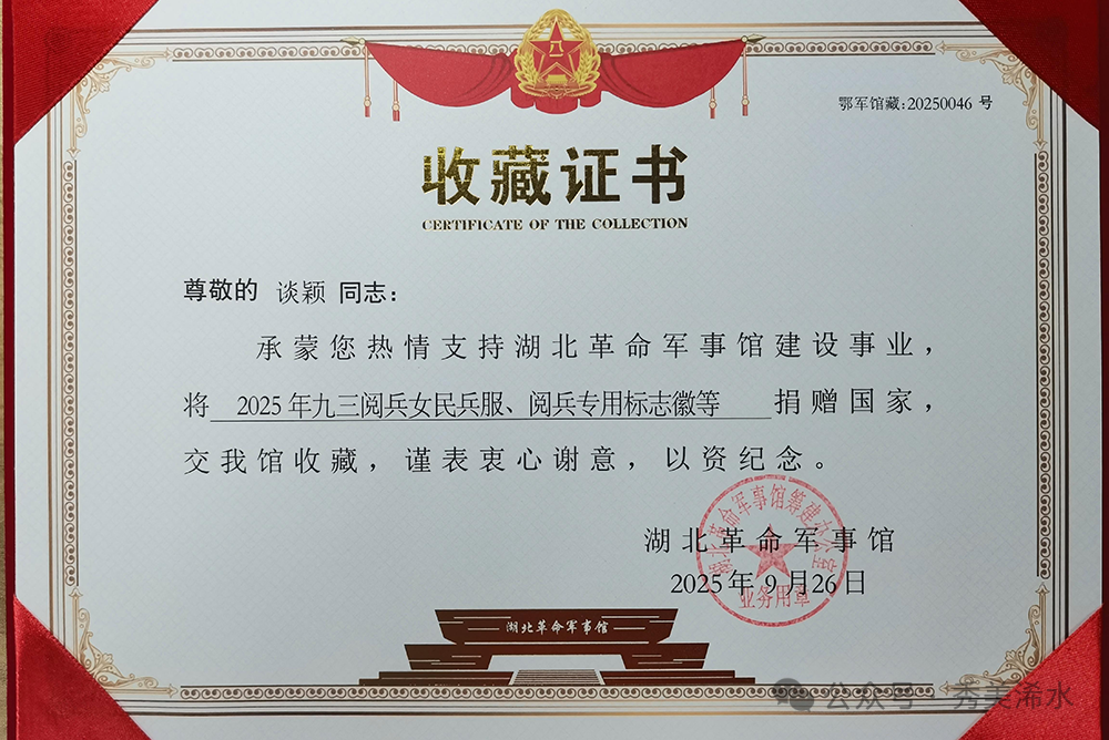 9月26日,一场特殊的捐赠仪式在湖北省革命军事馆(筹建办)举行。刚参加完纪念中国人民抗日战争暨世界反法西斯战争胜利80周年阅兵式的浠水籍女民兵谈颖,在县人武部领导刘刚的陪同下,将自己受阅时穿戴的全套服装、作战靴及标识徽章等11件物品,郑重捐赠给该馆永久收藏。这套承载着荣光与记忆的服装,成为展现新时代民兵风采的生动见证。