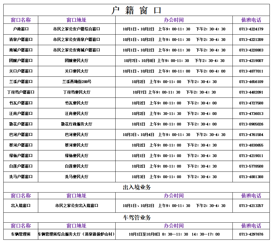 为最大化满足国庆节、中秋节期间群众办理公安业务需求,更好服务经济社会发展,浠水县公安局推出相关便民措施,国庆节、中秋节期间将继续提供节假日“不打烊”服务。具体安排公告如下: 浠水县公安局 2025年9月30日