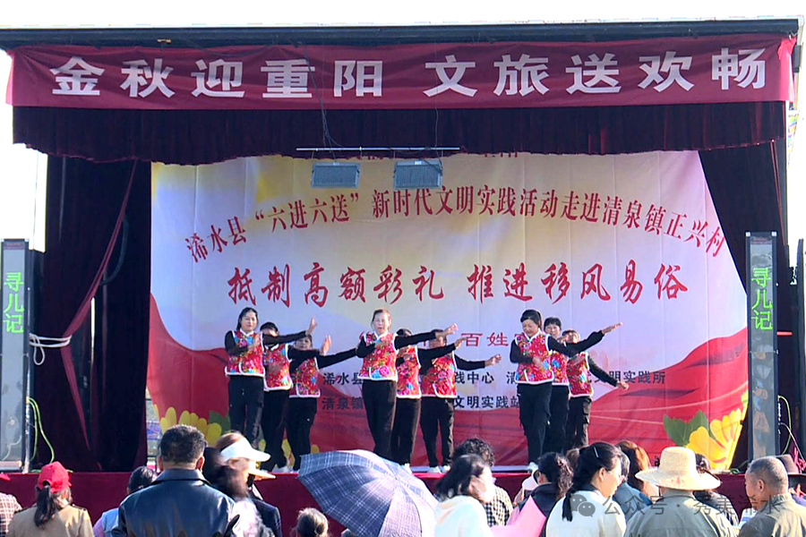 10月29日重阳节,由浠水县新时代文明实践中心、清泉镇新时代文明实践所主办的“抵制高额彩礼,推进移风易俗”“六进六送”文明实践活动在清泉镇正兴村举行,通过文艺演出、典型表扬、政策宣讲等形式,将文明新风吹入百姓心坎。
