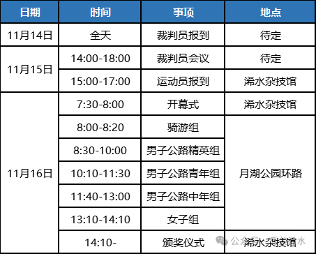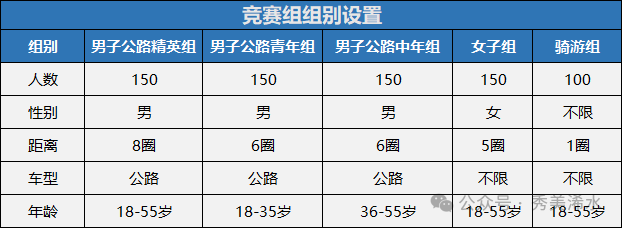 采用中国自行车运动协会审定的最新自行车竞赛规则。并执行本联赛竞赛规程及各单站补充通知。服装、器材、车辆自备。裁判长及主要裁判员由湖北省自行车运动协会选派。辅助裁判及其他岗位裁判员由赛区选派,由裁判长统一调配。因道路封闭,请所有运动员于7:30前进入主会场。男子公路精英组、青年组、中年组、女子组检录及比赛时间跟随上组比赛时间浮动,请及时检录进场。| 奖项设置