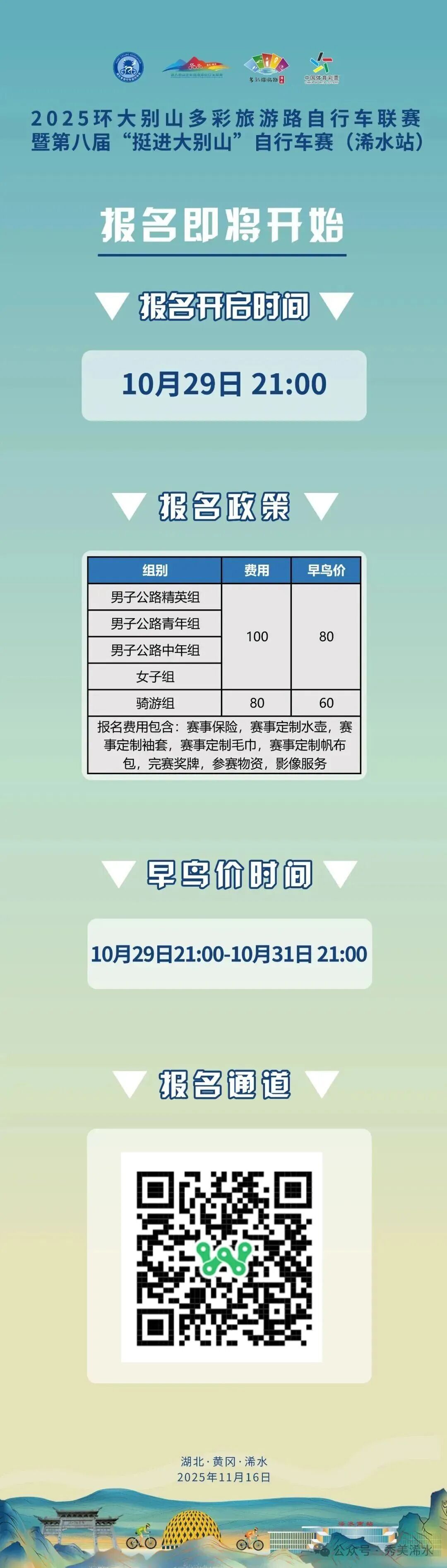 今年,热潮再起,精彩升级!2025环大别山多彩旅游路自行车联赛暨第八届"挺进大别山"自行车赛揭幕站,再度荣耀回归秀美浠水!去年的盛况犹在眼前,新的篇章待你共创。抓住这金秋时节,让我们再次相聚浠水,奏响这个秋天最激昂的运动乐章!1.长期从事体育锻炼、身体健康,且无扰乱赛事秩序的历史行为; 3.参赛运动员必须同意签署《自愿参赛免责承诺书》并到赛区持本人身份证或相关证明材料报到签字确认方可参赛。 4.本次赛事采取资格预审机制,报名选手须经组委会确认符合赛事资格后,方可确认参赛名额。| 黄冈籍选手资格认定