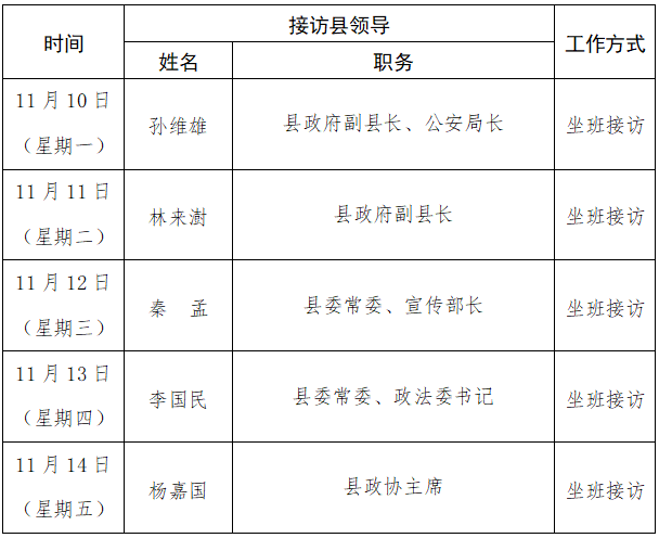 4.如遇县级领导工作冲突,县信访局将进行临时调整。