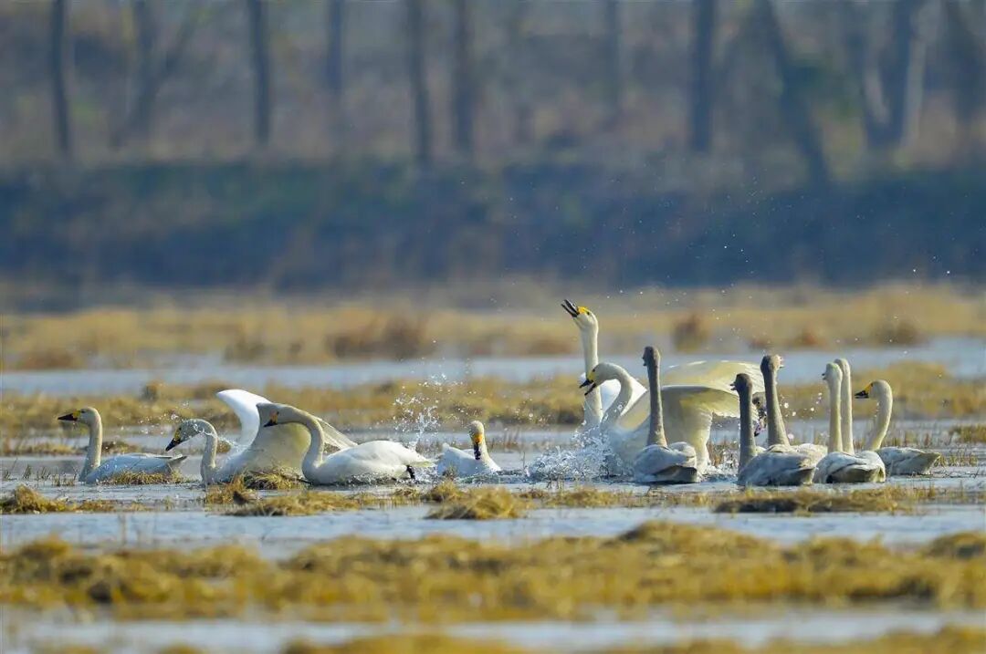 每年约有十几万只候鸟在此停歇越冬,为这片湿地注入源源生机。目前,黑鹳、小白鹭、灰雁等鸟类的迁徙活动仍在持续,预计将持续至明年3月。