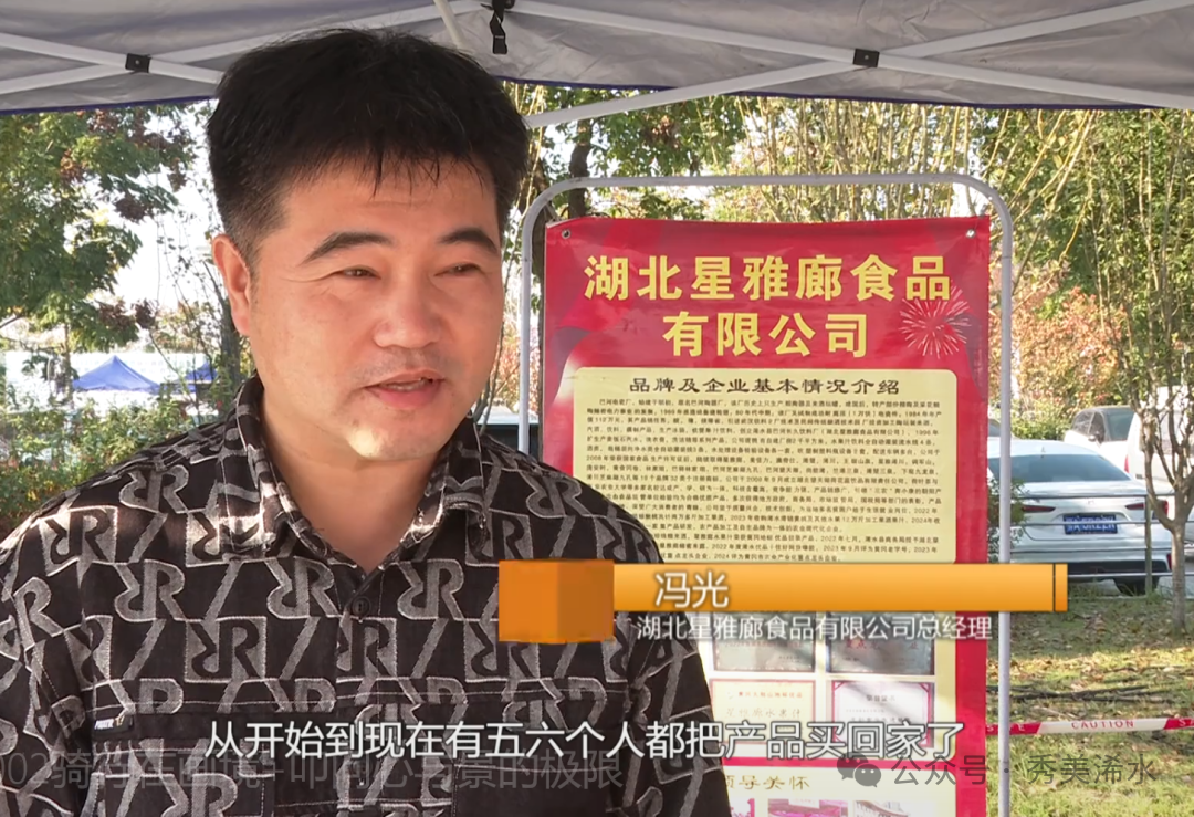 湖北星雅廊食品有限公司总经理 冯光:今天的赛事人流量很大,买的人特别多,这样能更好地把我们的地方特产推广出去。今天的销售情况非常好,截至到现在有五六个人买了产品回家。