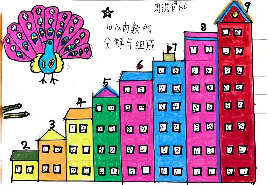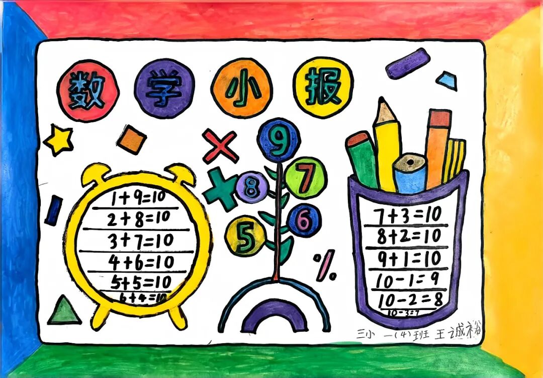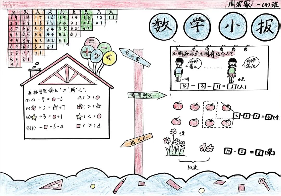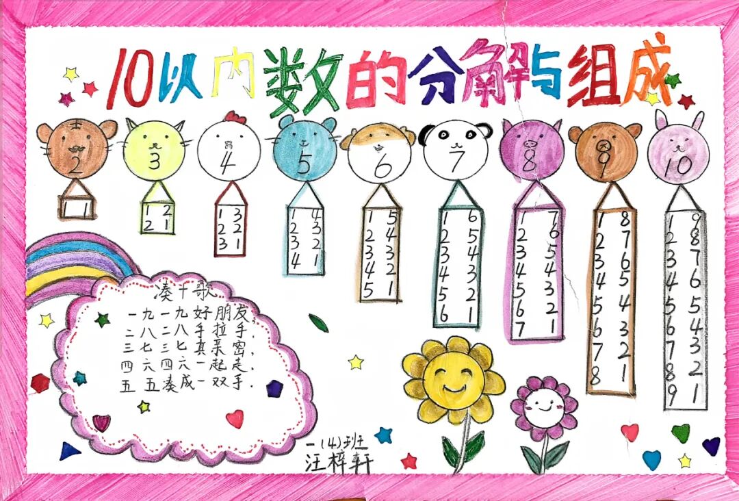 走进孩子们的作品,10以内数的分解与组成不再是枯燥的算式:有的把“凑十歌”藏进花朵里,“一九一九好朋友,二八二八手拉手”的口诀跟着花瓣舒展;有的让数字化身成会眨眼睛的小动物,10的拆分像搭积木般住进彩色“数字楼房”;还有的将加减法藏进云朵、闹钟、铅笔盒里,连“小明和小兰之间有几个人”的生活题,都成了手抄报里的趣味故事。