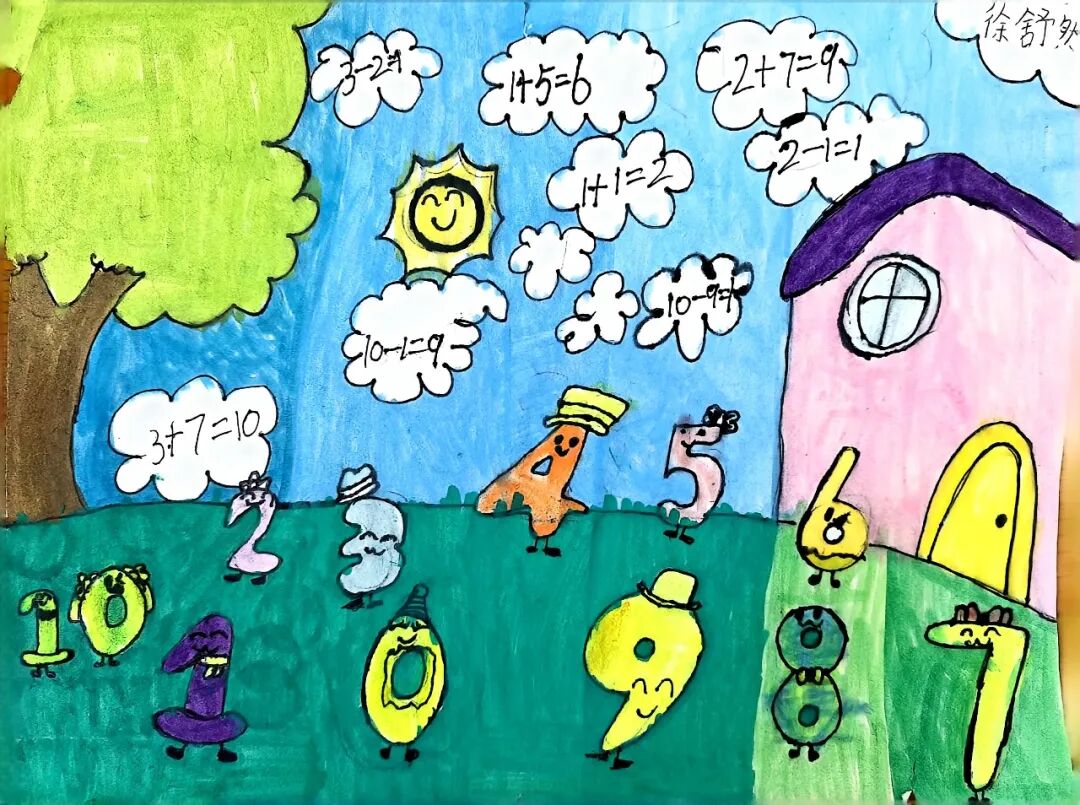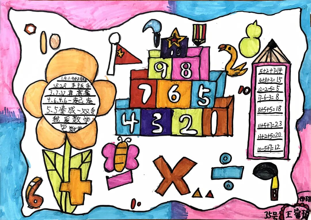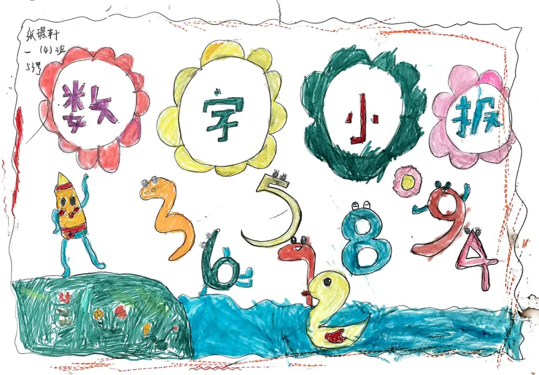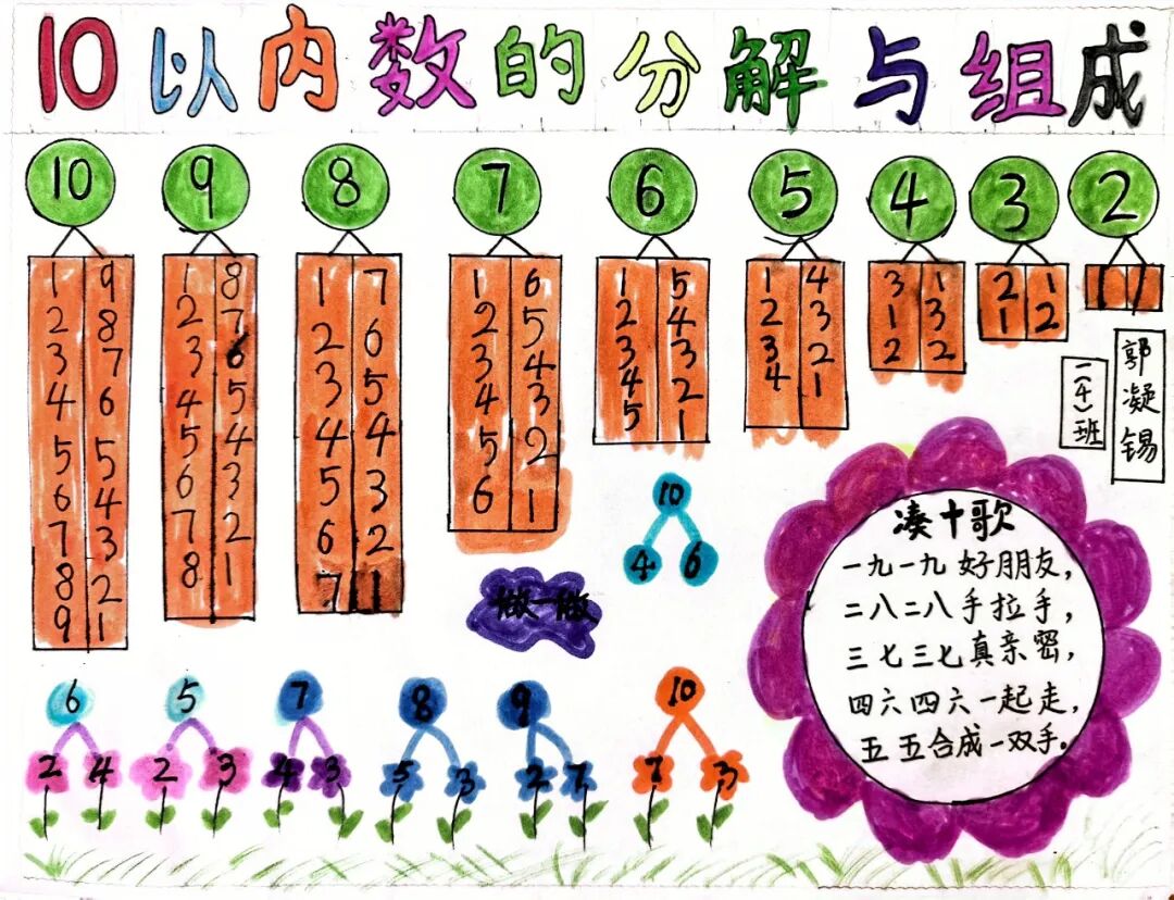 走进孩子们的作品,10以内数的分解与组成不再是枯燥的算式:有的把“凑十歌”藏进花朵里,“一九一九好朋友,二八二八手拉手”的口诀跟着花瓣舒展;有的让数字化身成会眨眼睛的小动物,10的拆分像搭积木般住进彩色“数字楼房”;还有的将加减法藏进云朵、闹钟、铅笔盒里,连“小明和小兰之间有几个人”的生活题,都成了手抄报里的趣味故事。