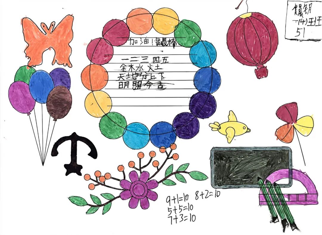 这些作品里,藏着“五育并举”的巧思:一笔一画的涂色、排版是美育的浸润,把数学知识转化为图画是智育的拓展,认真完成作品的专注是劳育的实践,而“加油!我最棒”的文字、活泼的卡通形象,更透着德育与体育(积极向上)的温度。数学与美术的跨学科融合,让抽象的数字变成了看得见、画得出的快乐——原来学“10的认识”,可以是给数字画笑脸,可以是编儿歌,也可以是造一座彩色的数字城堡。