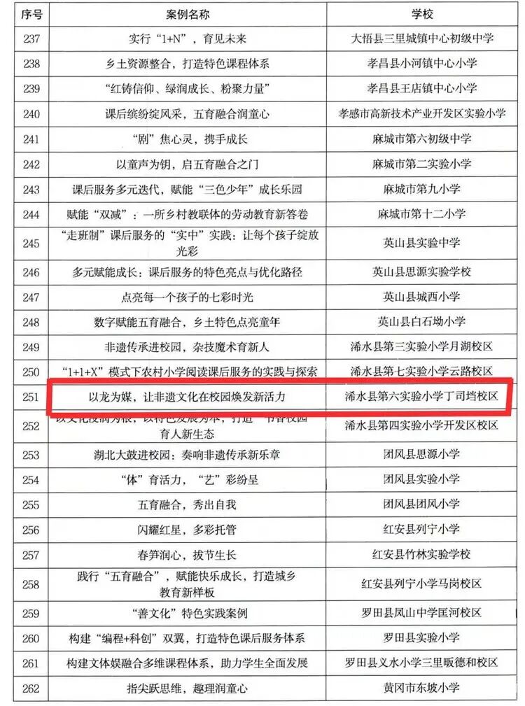 近日,湖北省教育厅办公室发布《关于义务教育学校课后服务特色案例的通报》,全省共确定 350 个义务教育学校课后服务特色案例,浠水县第六实验小学丁司垱校区报送的 “以龙为媒,让非遗文化在校园焕发新活力 —— 舞龙社团活动案例” 成功入选,成为黄冈市众多优秀案例中亮眼的一笔,标志着丁司垱校区课后服务工作获得省级层面的高度认可。