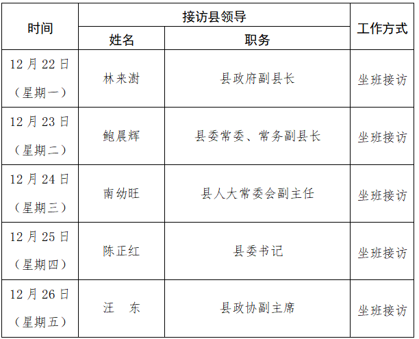4.如遇县级领导工作冲突,县信访局将进行临时调整。