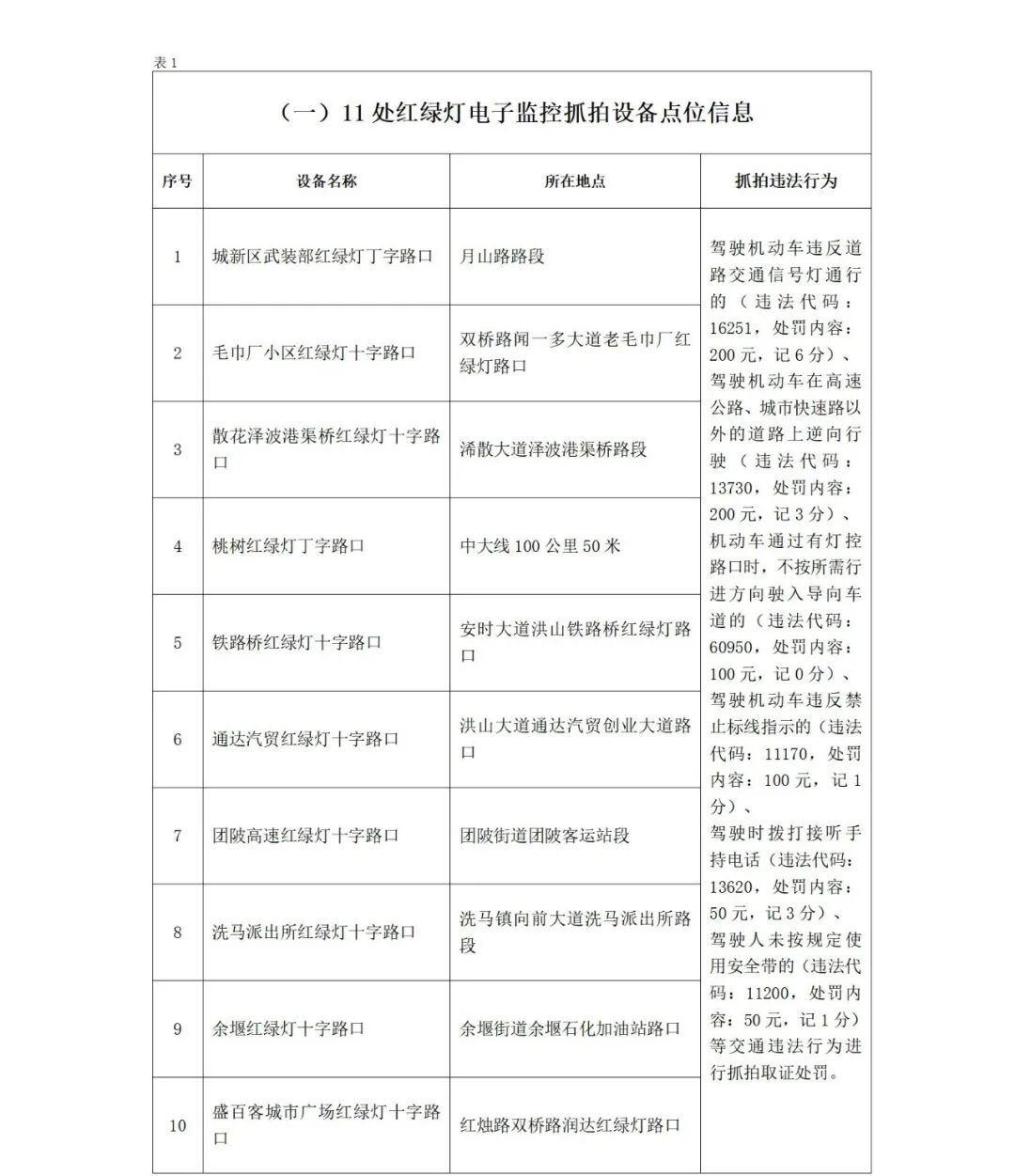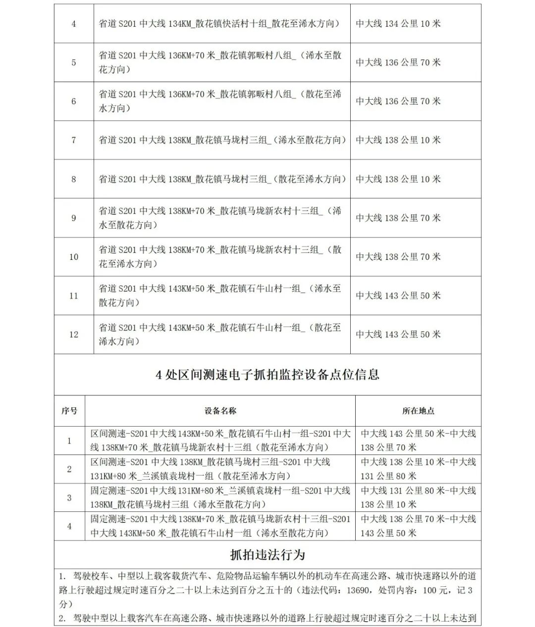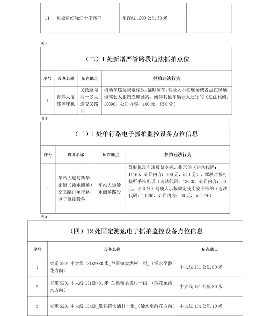 为确保我县道路交通安全畅通有序,提升道路通行效率,规范行车秩序,预防和减少交通事故的发生,保护人民群众生命财产安全,根据《中华人民共和国道路交通安全法》《中华人民共和国道路交通安全法实施条例》《道路交通安全违法行为处理程序规定》等法律法规及相关规定,浠水县公安局交通管理大队对13处(11处红绿灯、1处严管路段、1处单行路)电子警察设备进行升级改造,以及在易发生交通事故路段新增的16处(12处固定测速、4处区间测速)电子测速设备,将于2026年1月7日零时启用,对驾驶机动车违反道路交通信号灯通行、逆向行驶、违反禁止标线、驾驶时拨打接听手持电话、未按规定使用安全带的、超速等违法行为进行抓拍,特此向社会公示(设备信息详见附表),(除本次升级改造路口路段外,原公示路段电子警察抓拍设备持续有效)。