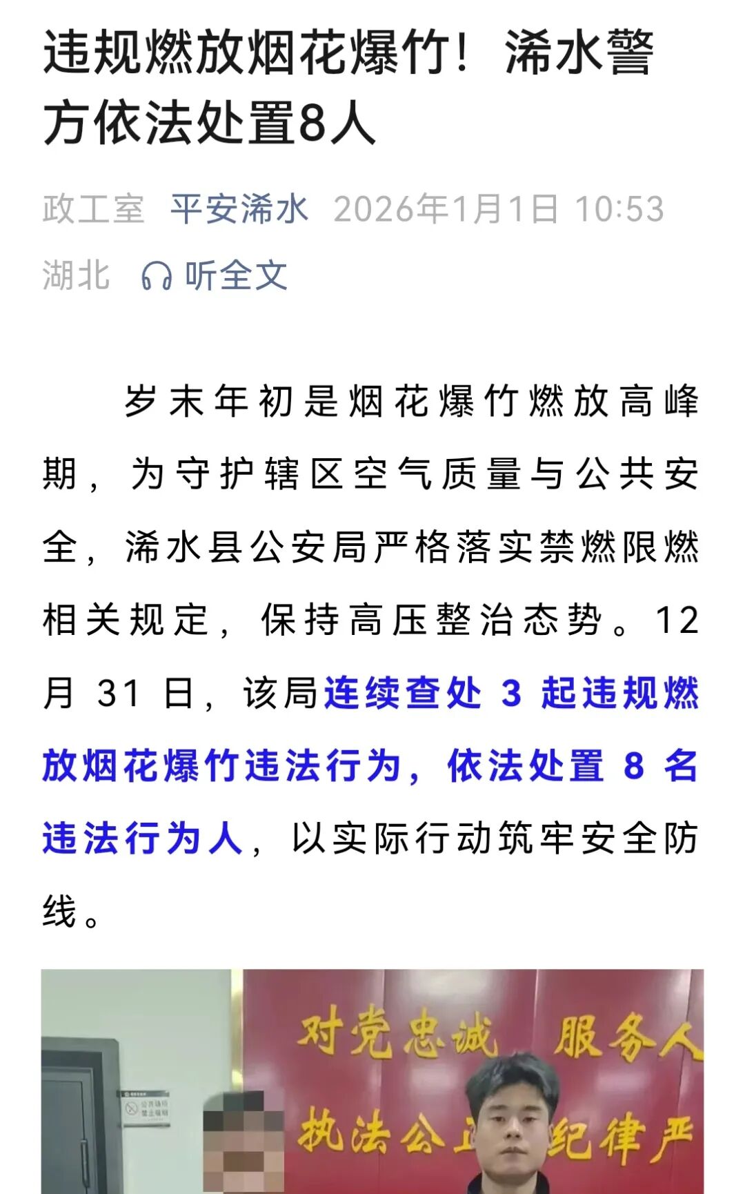 烟花爆竹燃放时会产生大量有毒有害气体,污染空气环境,极易引发火灾、爆炸等安全事故,造成人员伤亡和财产损失;同时,违规燃放烟花爆竹属于违法行为,必将依法受到处罚。恳请广大群众自觉遵守禁燃限燃相关规定,选择电子祝福、民俗表演、鲜花点缀、手写贺卡等文明环保的方式欢度佳节,携手共建平安、洁净、文明的美丽浠水。(通讯员:蔡俊 南韦)