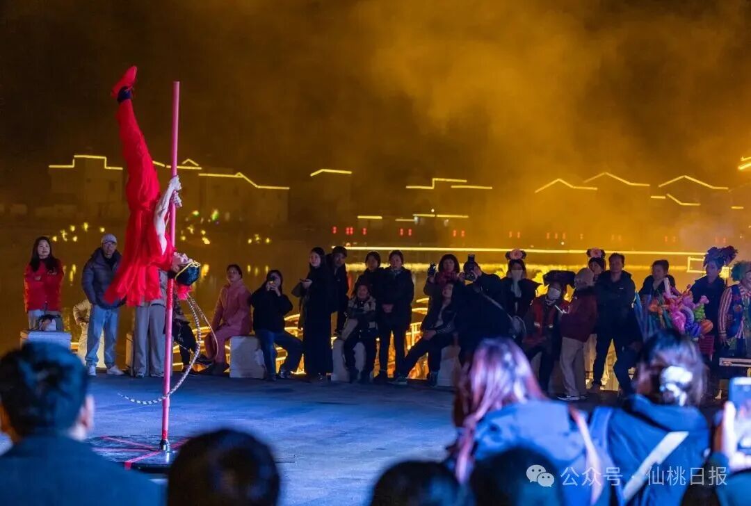 当晚,参加2026第三届沔商大会的沔商代表走进袁市村观赏新年灯会,在一河两岸的流光溢彩中,实地感受仙桃农文旅体融合发展“丰”景。沿河露台上,古风舞蹈舒展衣袖,喷火表演映红水面,非遗打铁花如星雨倾泻。