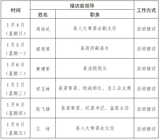 4.如遇县级领导工作冲突,县信访局将进行临时调整。