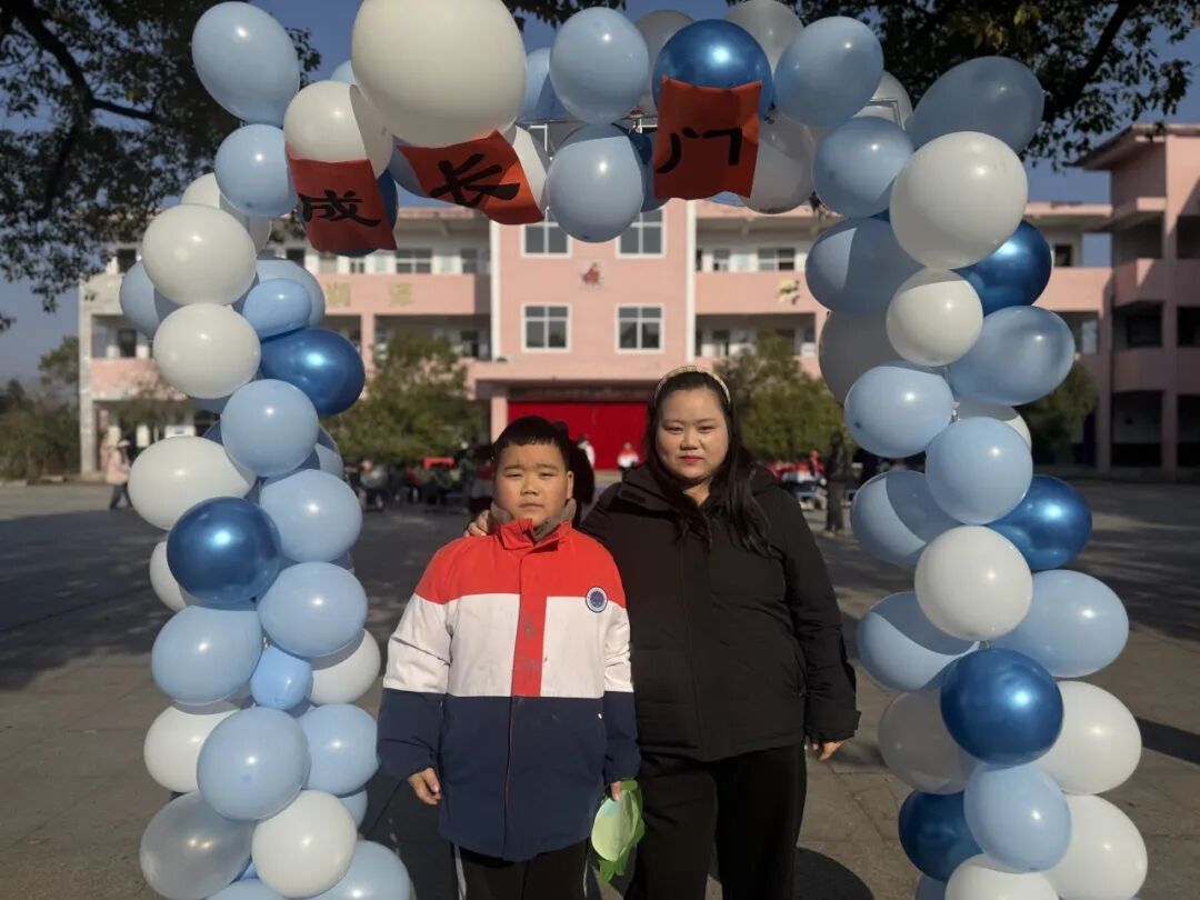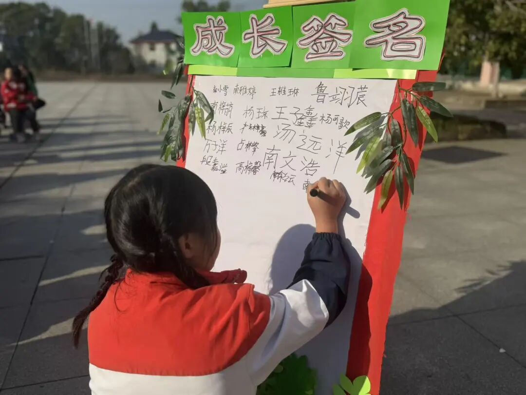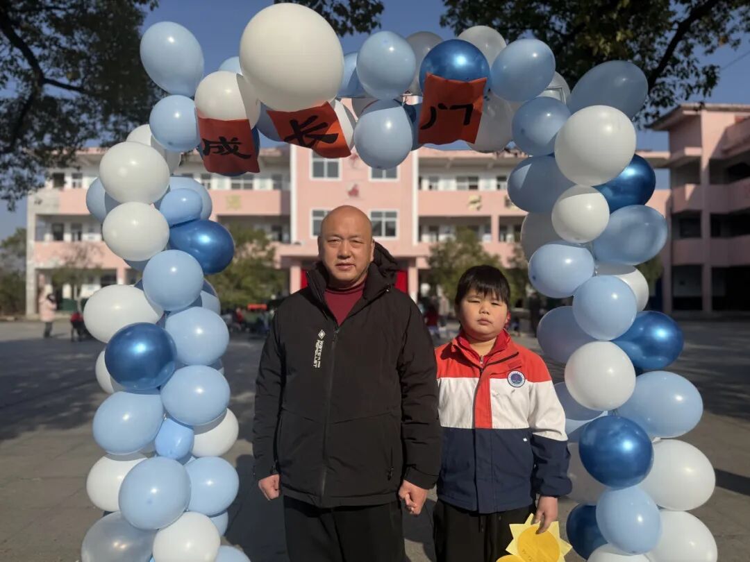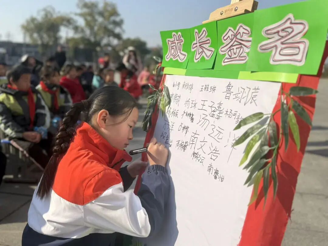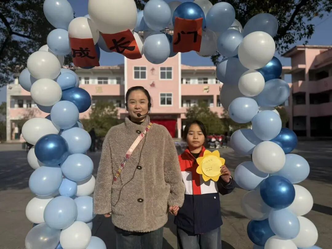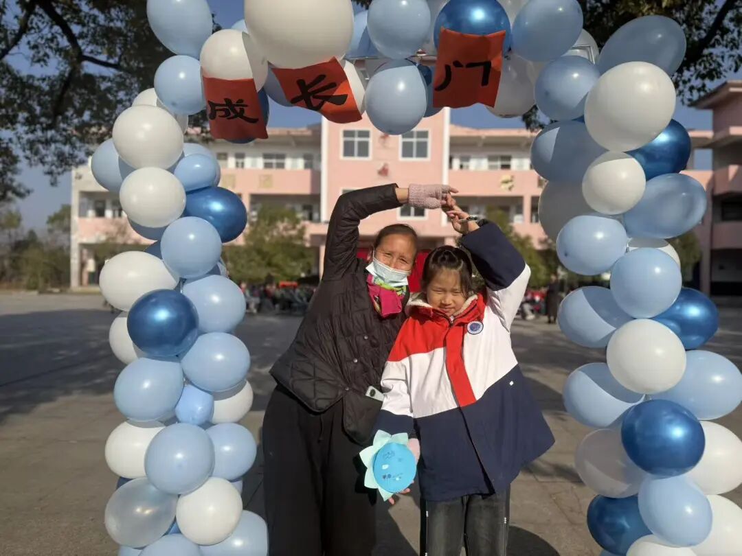 随后,主持人在操场登台致辞,点明活动主题与意义,正式拉开成长礼的帷幕。四年级学子,手持提前精心制作的“成长心愿卡”——卡片上满载个人成长期许与对家国的美好祝愿,与家长手牵着手,缓缓穿过“成长门”。穿过象征蜕变的大门后,亲子携手在签名板上郑重签下姓名,定格这一意义非凡的成长时刻,而后有序入座。