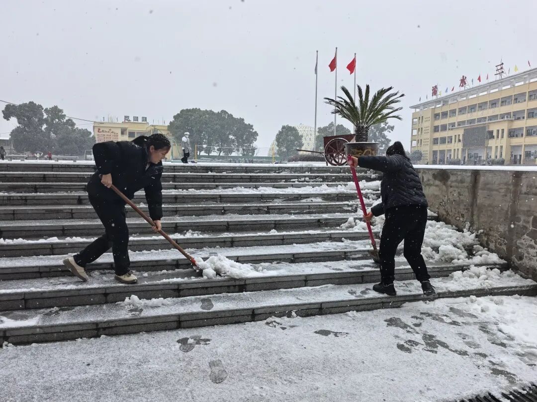 学校领导带头,教职工们手持工具,重点对红烛路口、学校大门口、教学楼周边、主干道、台阶坡道、食堂门口等学生高频通行区域清雪铲冰,合力破除顽固冰层。经过奋战,校园通行道路全面清理完毕,学校同步在易滑区域铺防滑垫、设警示标识,课间安排教师值守引导通行,全方位消除冰雪安全隐患,为学生筑牢出行安全防线,保障校园教育教学秩序平稳。