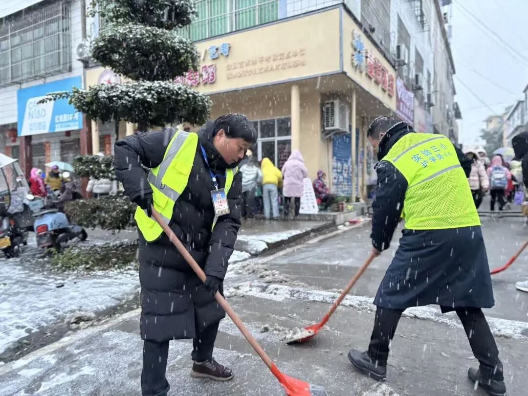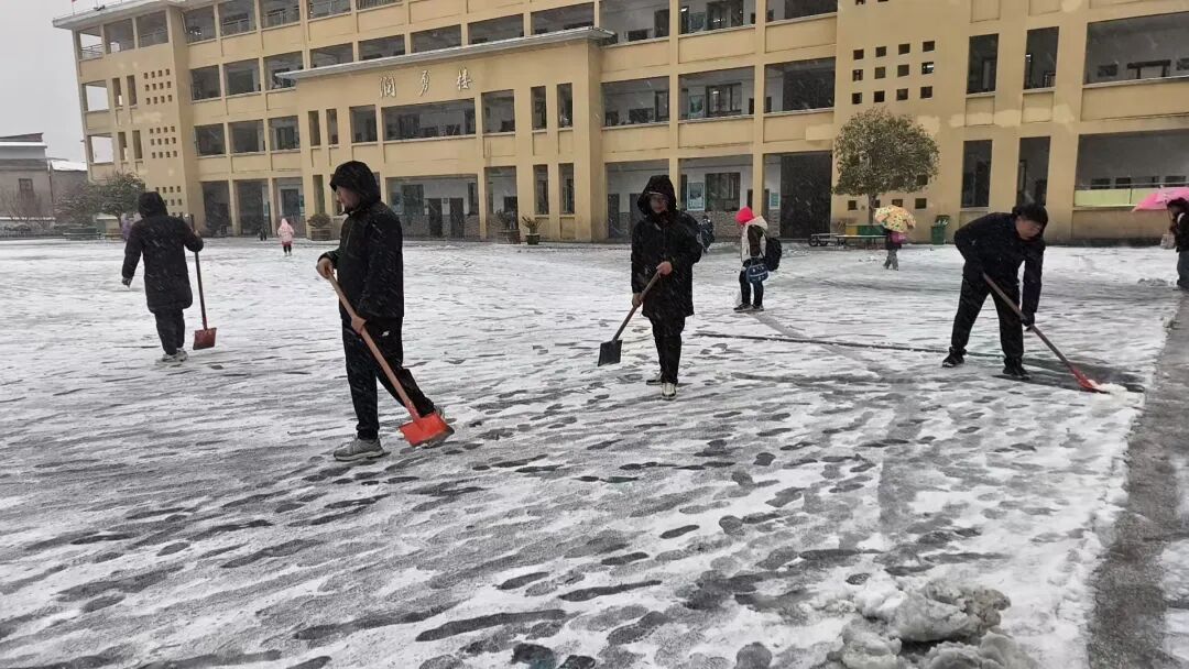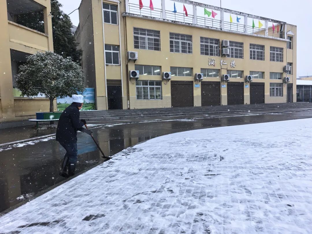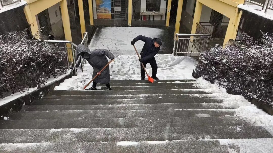 今日雨雪冰冻天气导致校园路面积雪结冰,浠水县第三实验小学迅速启动应急预案,全体教职工齐上阵开展除雪破冰工作。