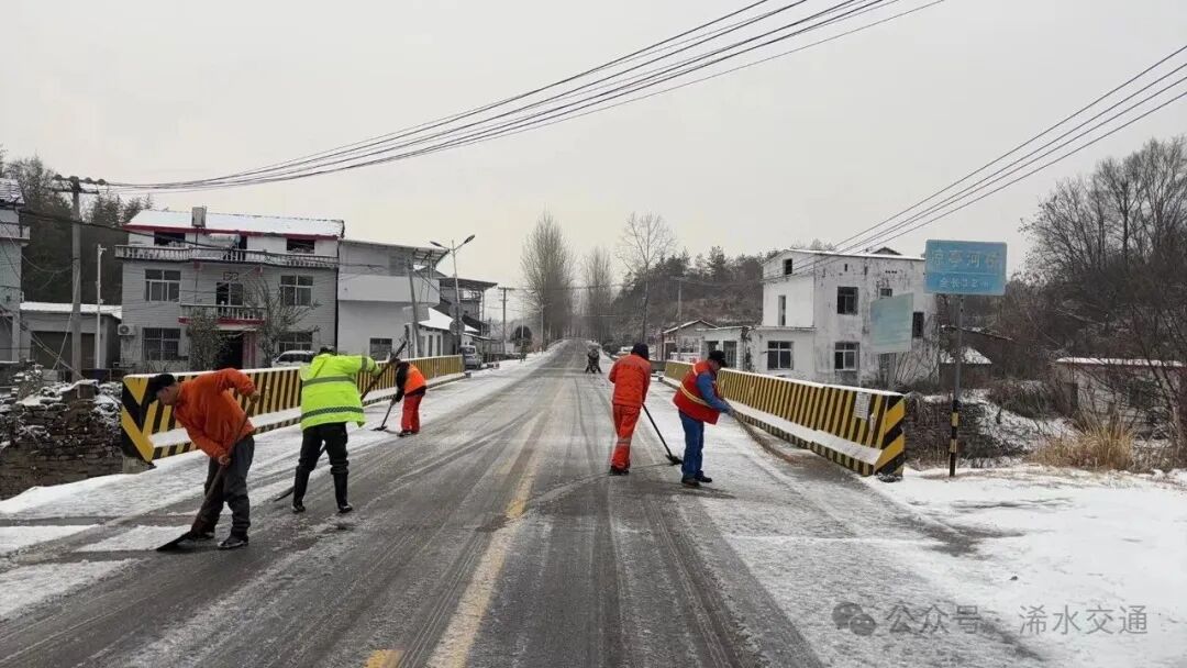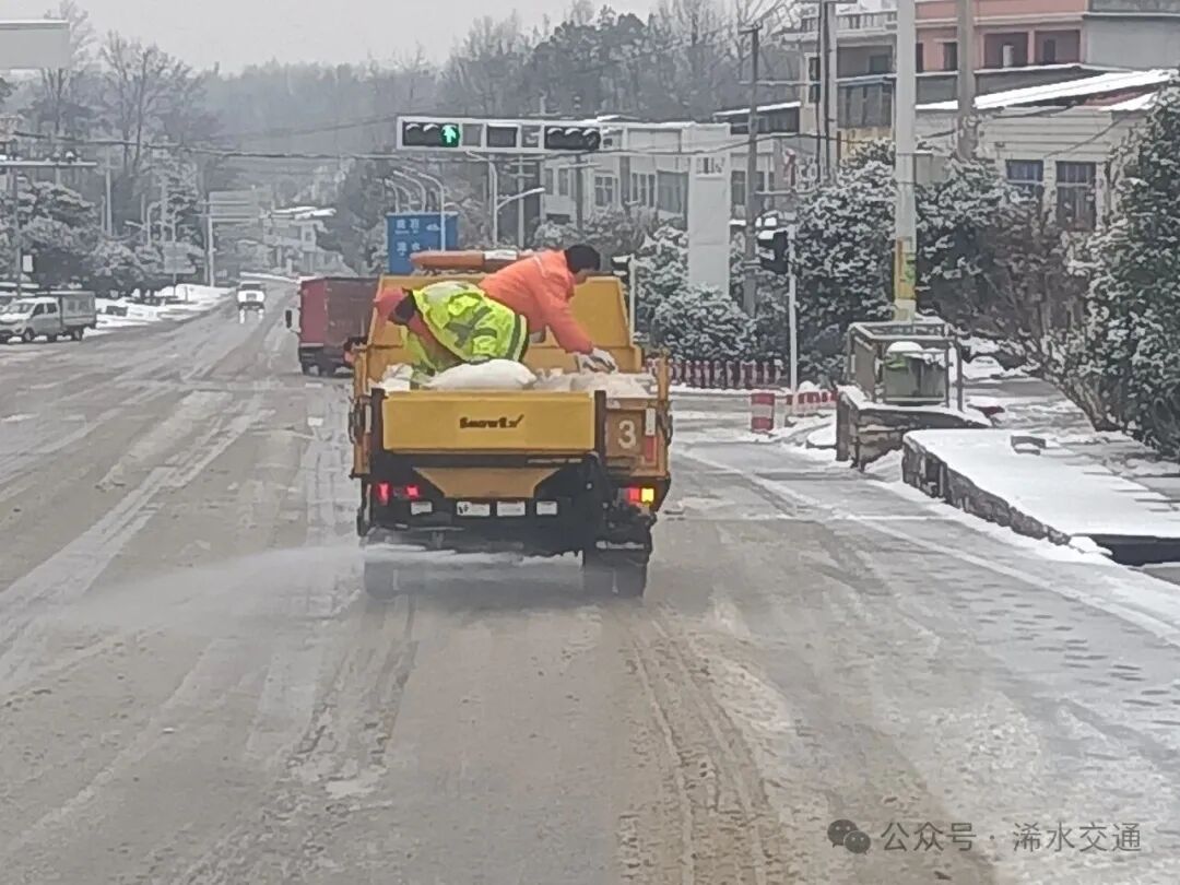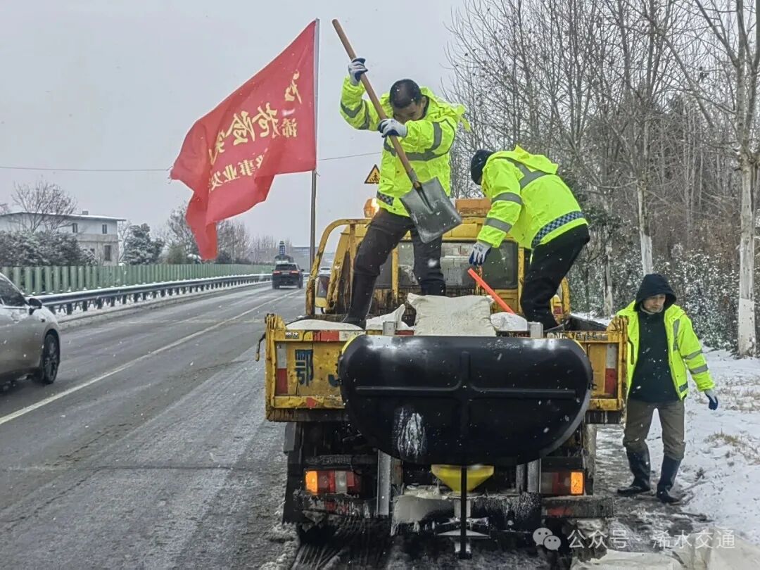面对持续雪情,浠水县交通运输局公路事业发展中心应急机制高效运转。从深夜到清晨,一线人员无休坚守,抢险队伍连续作业。中心通过“实时巡查+指挥平台监测”,按照2小时一轮的频率持续巡查,并针对急弯陡坡路段及桥梁重点维护,精准掌握桥梁、陡坡、急弯等重点路段积雪结冰动态。针对边清边下、反复积雪的情况,调度撒布机高频次作业撒布融雪剂,养护人员同步用铁锹、扫帚清理积雪。同时,沿线可变情报信息板持续发布“雪天慢行”“保持车距”等安全提示,引导车辆谨慎通行。