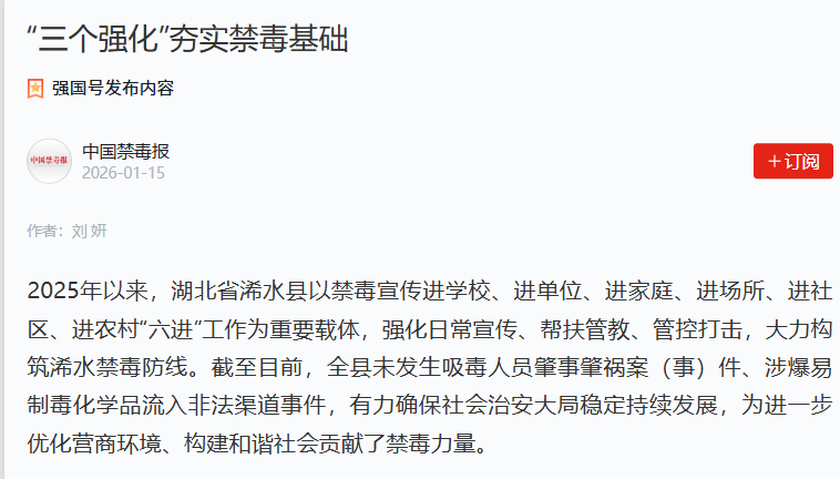 2025年以来,湖北省浠水县以禁毒宣传进学校、进单位、进家庭、进场所、进社区、进农村“六进”工作为重要载体,强化日常宣传、帮扶管教、管控打击,大力构筑浠水禁毒防线。截至目前,全县未发生吸毒人员肇事肇祸案(事)件、涉爆易制毒化学品流入非法渠道事件,有力确保社会治安大局稳定持续发展,为进一步优化营商环境、构建和谐社会贡献了禁毒力量。