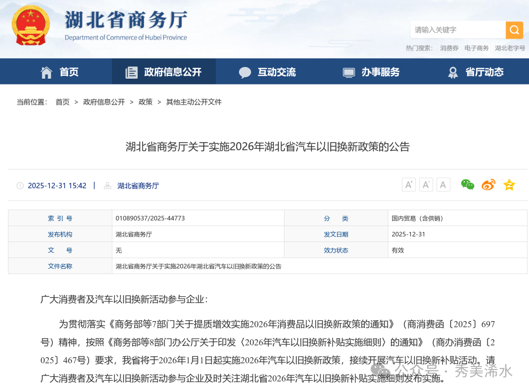 2025年12月31日,省商务厅发布关于实施2026年湖北省汽车以旧换新政策的公告,明确我省将于2026年1月1日起实施2026年汽车以旧换新政策,接续开展汽车以旧换新补贴活动。