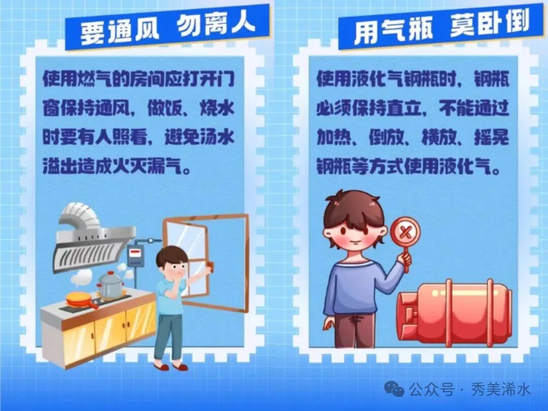 4、瓶、管、灶、阀要合规,不要违规操作。液化气用户需使用合格气瓶,选择正规企业供气,使用金属波纹连接管和自动切断阀,使用带熄保未超期的燃气器具,用气时不离人,定期检查连接处是否漏气,发现异常迅速与供气企业联系处理,发现违规运输、存储钢瓶或危害公用安全的行为请拨打110报警处理。