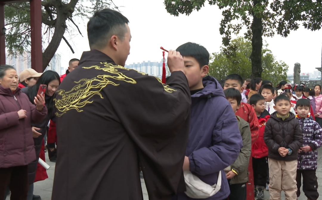 仪式现场,师长手持朱红丹砂,轻轻点在学童额头,寄托着对孩子们“眼明心亮、学业精进”的美好期许。随后,孩子们击鼓明智,清脆的鼓声承载着孩子们的求学心愿,响彻文庙庭院。