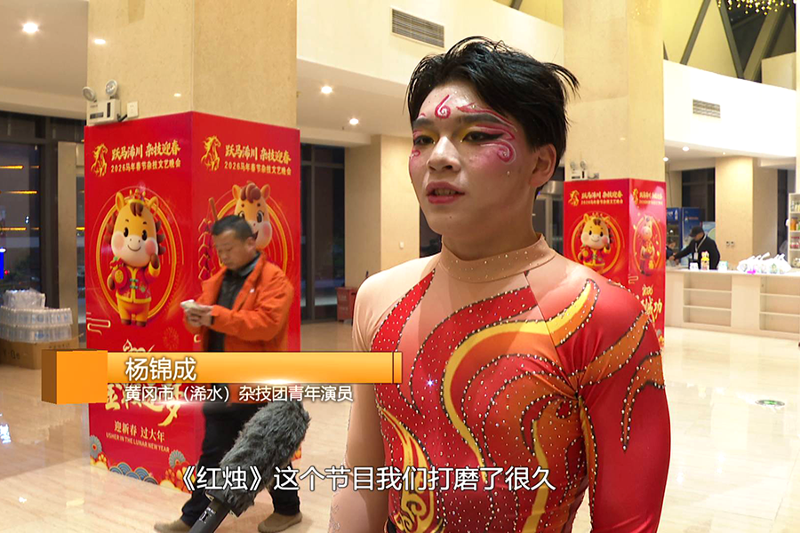 黄冈市(浠水)杂技团青年演员 杨锦成:《红烛》这个节目我们打磨了很久,不仅要展现杂技的高难度技巧,更要传递红烛精神和浠水人的文化底蕴,能够在春节晚会上为家乡人表演,我们都感到特别荣幸,最后祝大家马年大吉,平安喜乐!