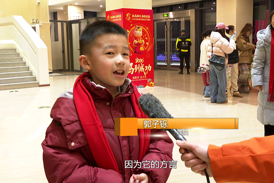 观众 郭子铄:我是跟爸爸妈妈一块来的。今天节目很好看,我最喜欢小品,因为它的方言,还有最后的唱跳,感觉很有趣。