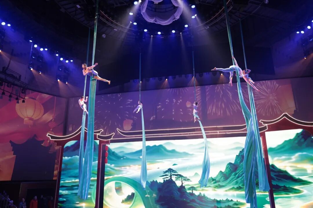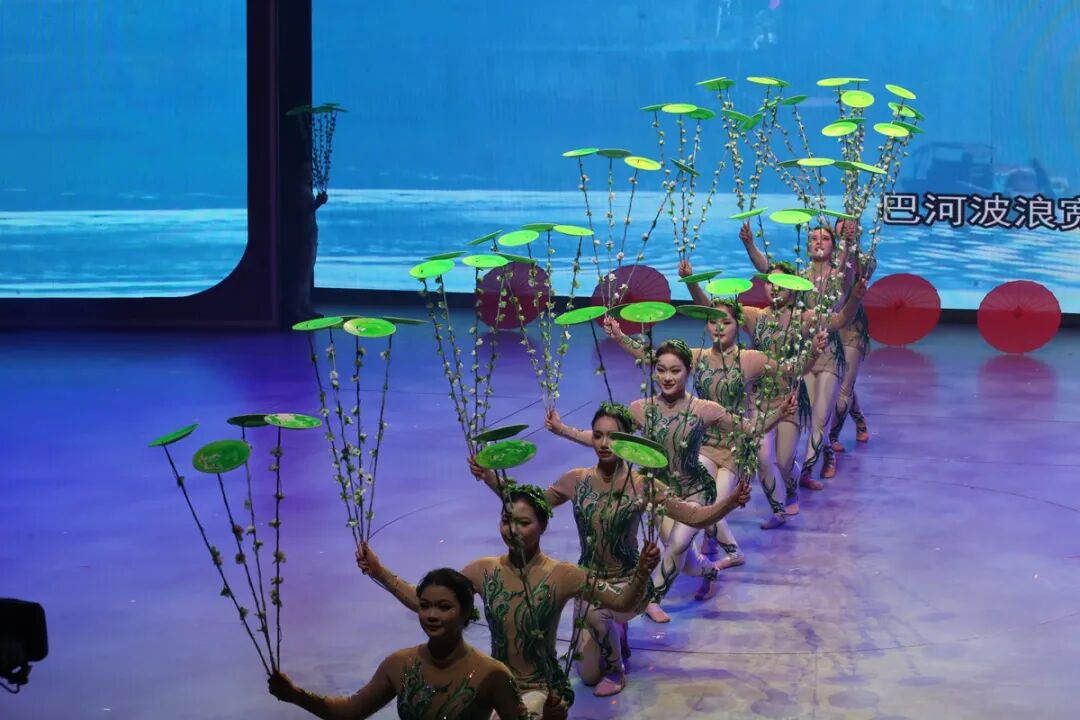 晚会后段,节目聚焦浠水的自然风光与时代发展。《观溪》《梦回浠水》旋律优美,表达对家乡的热爱与眷恋;相声《浠水方言》幽默风趣,演员接地气的表达让现场观众捧腹大笑,也展现了浠水方言的独特魅力;杂技《丝路花语——绸吊》更是惊艳全场,演员们将丝绸的柔美与杂技的惊险完美融合,惊艳全场。