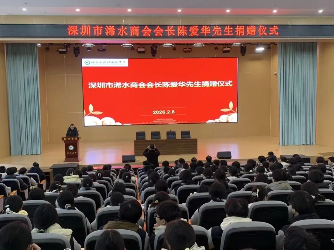 2月8日上午,团陂高中86届校友、深圳市浠水商会会长、红树林国际研学营地创始人陈爱华捐赠仪式在学校建全图书馆报告厅举行。校级领导及2026届高三全体师生见证这一暖心时刻。