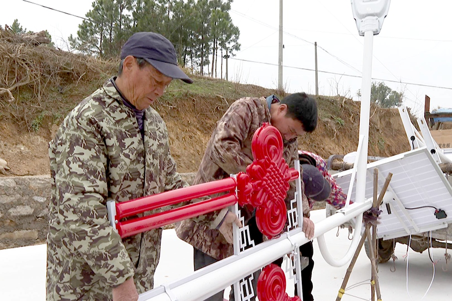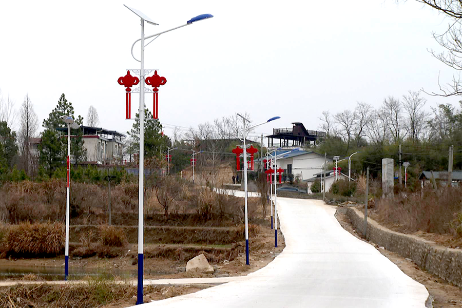 在杨祠村崭新的水泥路上,路面平整宽阔,车辆往来顺畅。工人们正忙着安装路灯、调试线路,一根根崭新的路灯杆整齐排列,让村民夜间出行更安全、更便捷。