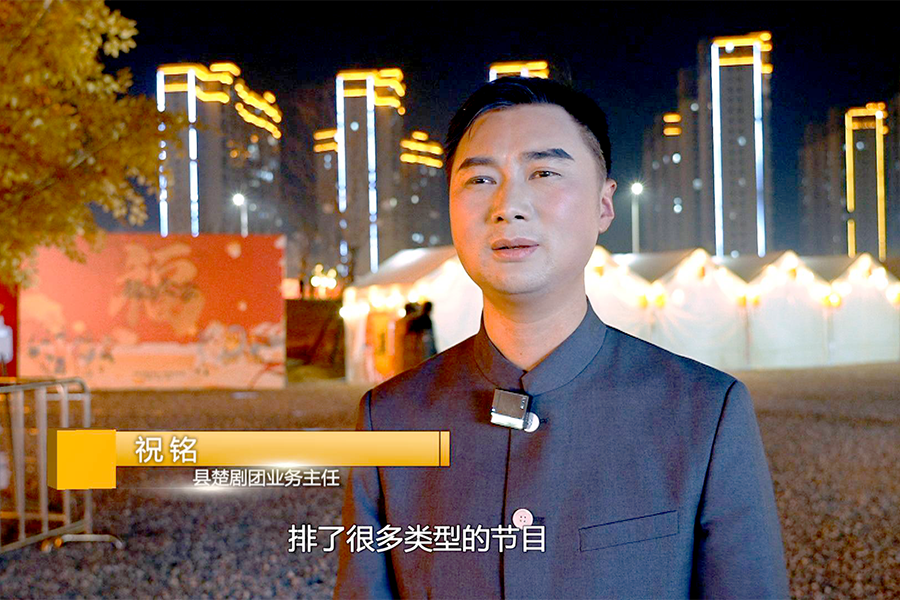 县楚剧团业务主任 祝铭:我们浠水县楚剧团为了这次的演出,排了很多类型的节目,有歌有舞,有戏曲,有小品,还有我们黄冈最具特色的文化小剧。今天我们演的《血色石碑》,就是我们浠水县博物馆的一个以一级文物为背景创作的节目,节目非常精彩。希望我们的节目能带给大家快乐,也能丰富广大市民朋友的节日期间的精神文化生活。
