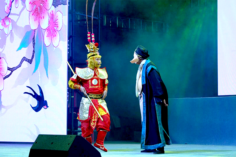 夜幕降临,时光营地舞台灯光亮起。开场舞《舞起来》以欢腾的节奏瞬间点燃全场,楚剧唱段《李双双》韵味悠长。文化小剧《七子之歌》以历史长卷为幕,将家国情怀演绎得扣人心弦,情景剧《孙悟空痛打猪八戒》则以诙谐幽默的表演风格,赢得老少观众的连连喝彩。