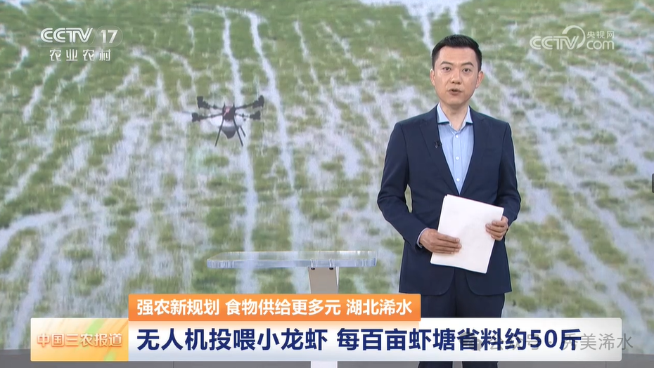 CCTV-17《中国三农报道》聚焦浠水农业新质生产力。在“强农新规划 食物供给更多元”的主题下,报道了湖北浠水创新利用无人机投喂小龙虾。这项技术不仅精准高效,更能实现每百亩虾塘省料约50斤,为生态养殖和降本增效写下了生动的浠水注脚。