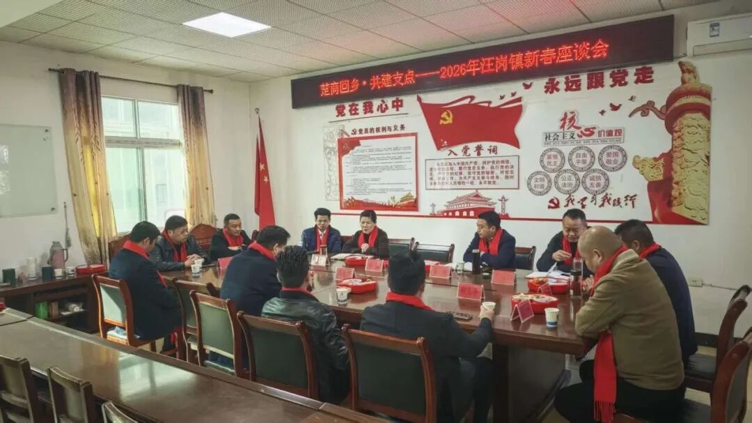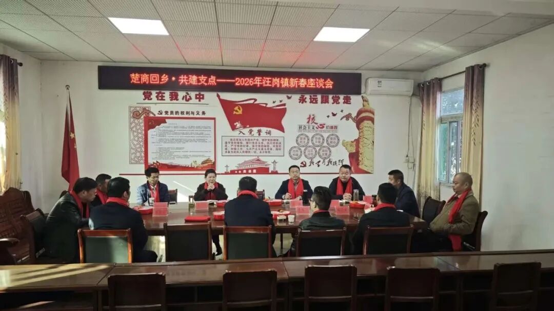 2月21日,汪岗镇召开“楚商回乡· 共建支点”2026年新春座谈会。会上,各位返乡乡贤、企业家代表齐聚一堂,话乡情、谋发展、绘蓝图。