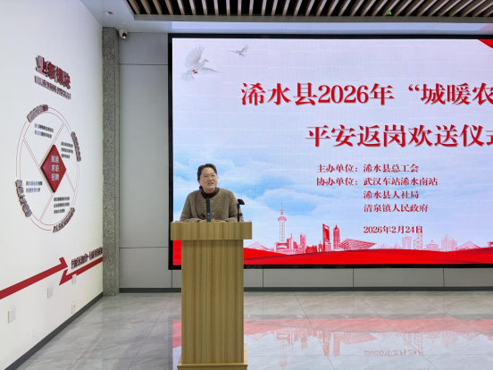 正月初八,新春开工正当时,浠水县总工会2026年“城暖农民工”平安返岗欢送仪式在浠水南站工会驿站成功举行。县总工会党组书记、常务副主席谢红梅出席活动并讲话,武汉高铁浠水南站副站长肖功峰,县人社局副局长游炎烽,县总工会副主席余有平,清泉镇工会主席周晓勤等相关负责人共同参加活动,为122名即将搭乘G2705次3号、4号爱心专列奔赴深圳方向的浠水籍务工人员送行。