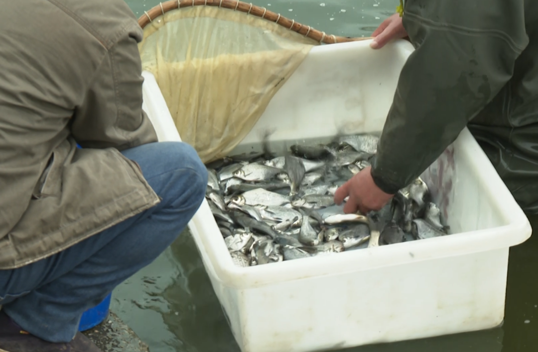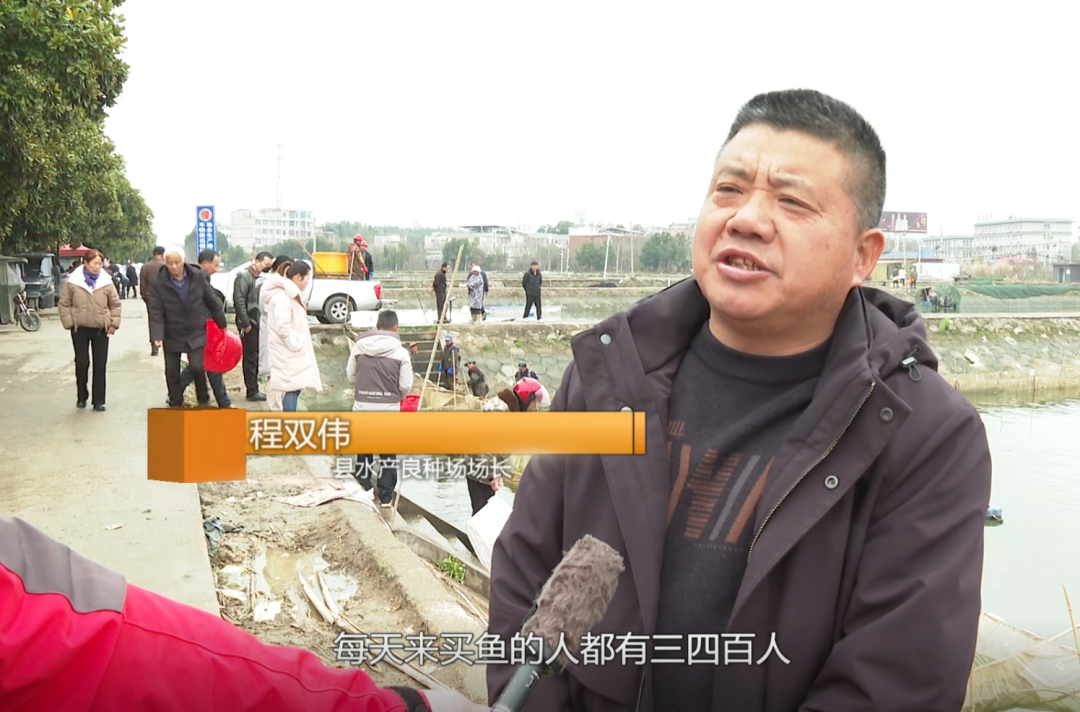 县水产良种场场长 程双伟:从开春到现在,每天来买鱼的人都有三四百人,鱼苗每天的销售量能达到三万斤,要持续卖到正月底。