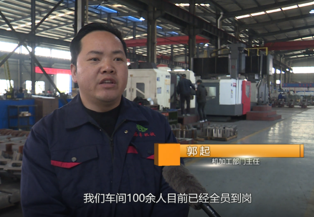 湖北腾丰机械科技有限公司机加工部门主任 郭起:我们车间100余人已经全员到岗。当前,我们正在赶制一批高速多工位冷镦机、热镦成型机的零部件。