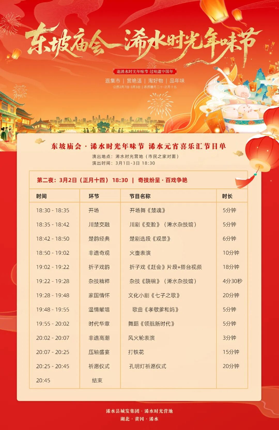1.主题夜演:正月十四的“奇技纷呈·百戏争艳” 、正月十五的“互动狂欢·共祈团圆”大型主题晚会,将按原节目单(除花车巡游环节)在时光营地舞台精彩上演。