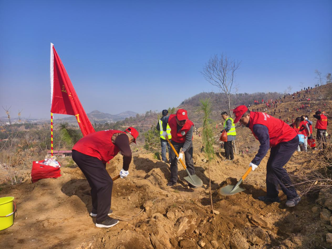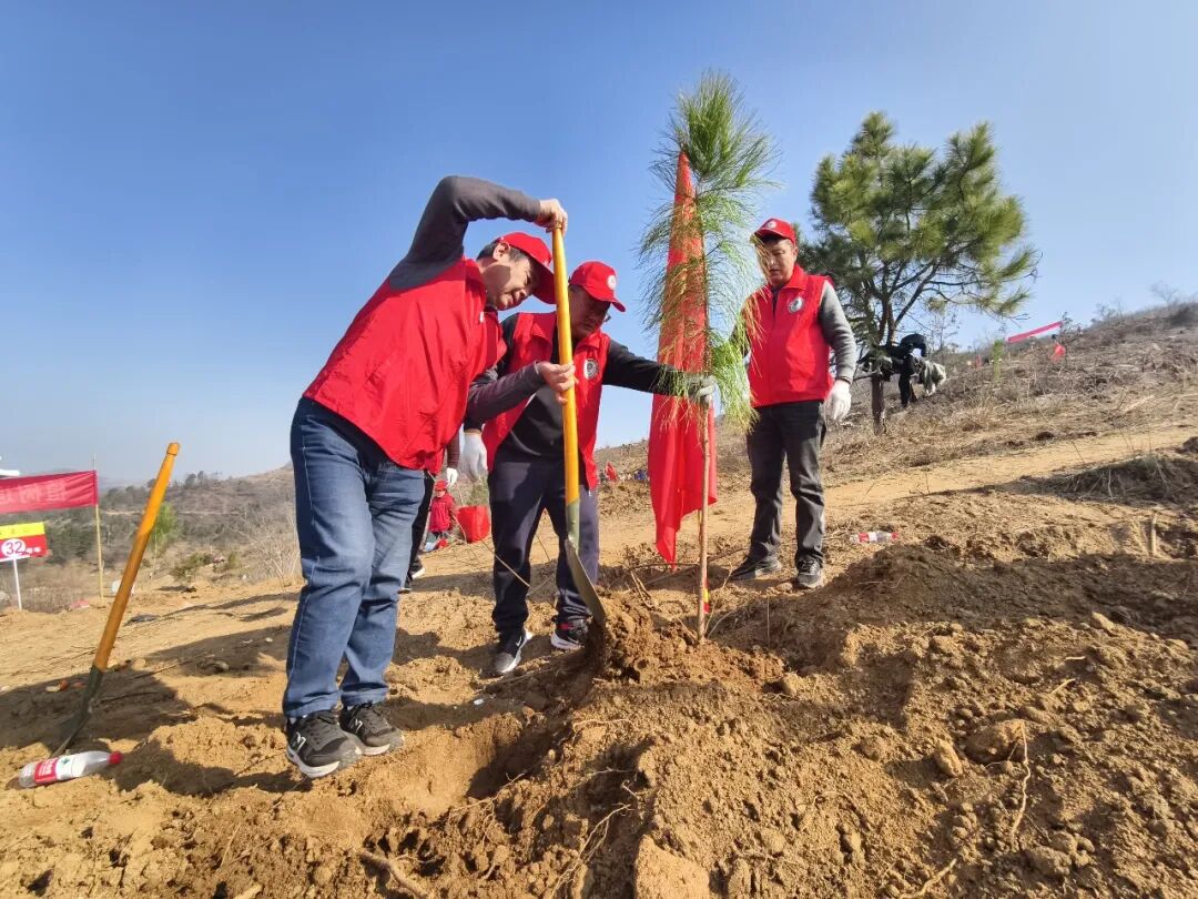 植树现场,志愿者们身穿红马甲,分工协作、配合默契。挥锹挖坑、扶苗培土、提水浇灌,志愿者们一丝不苟、干劲十足地完成每个步骤,充分展现出退役军人不怕苦、不怕累、团结协作的良好风貌。