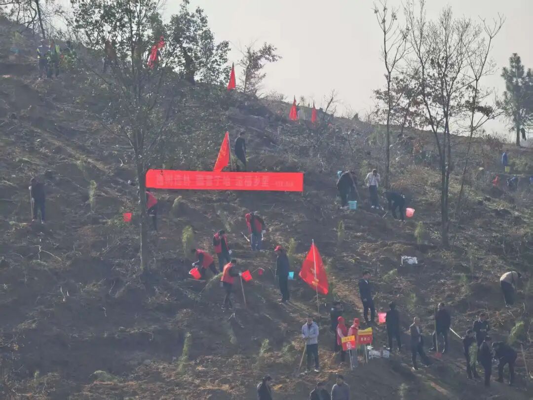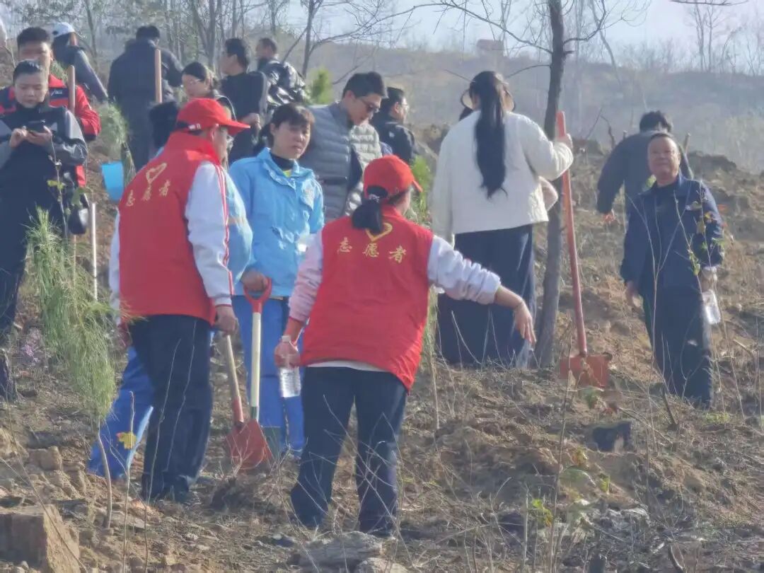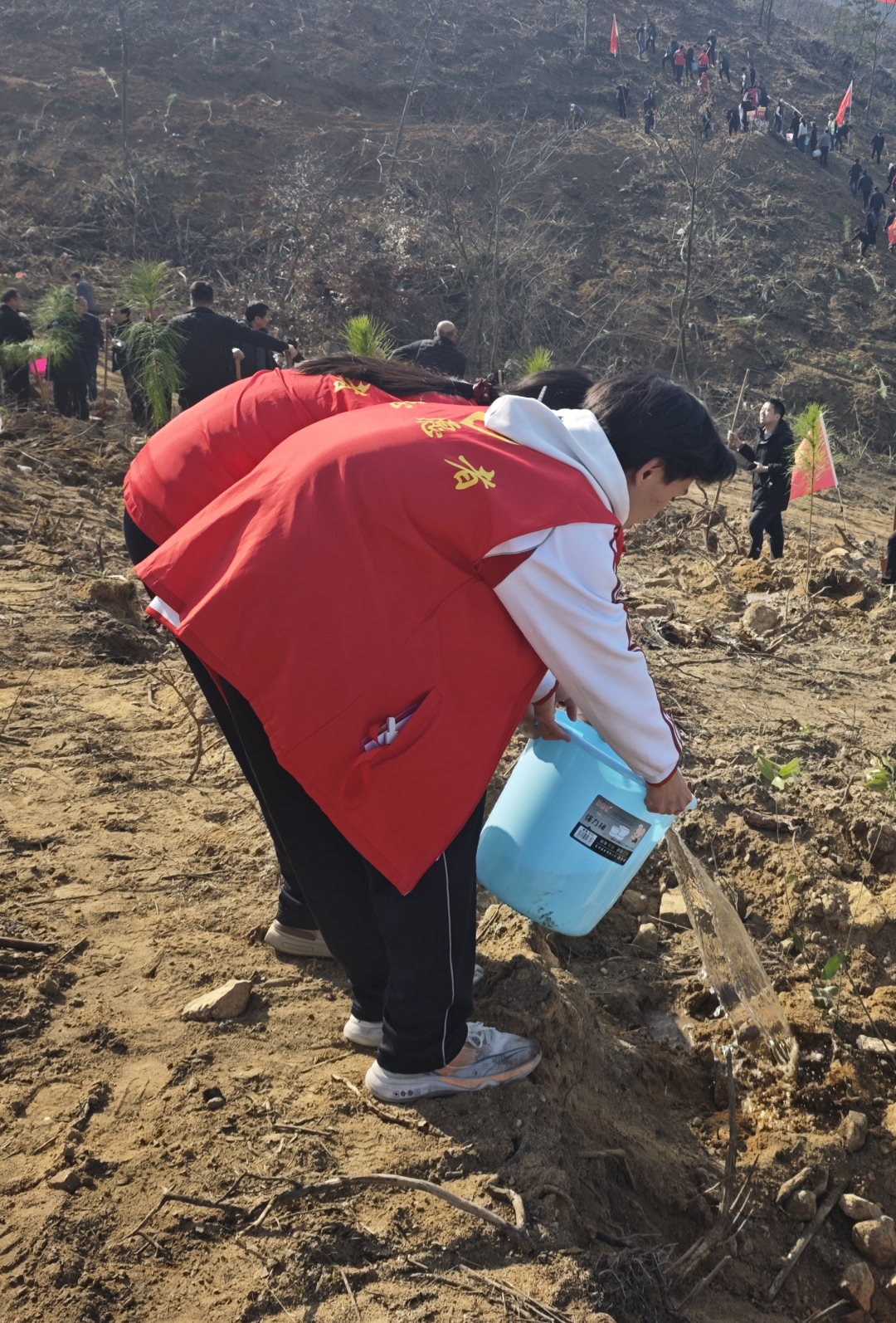 本次活动中,志愿者们身着红色马甲,成为植树现场一道亮丽的风景线。志愿者们分布在各个植树点位,引导各单位人员有序前往各指定植树点位,确保植树活动高效推进。他们穿梭在山间,将矿泉水和橘子分发给每一位参与植树的干部职工,为大家补充能量。有树苗栽种完成后,志愿者们主动承担起打水浇水的任务,确保每一株新栽的树苗都能喝足定根水,提高成活率。
