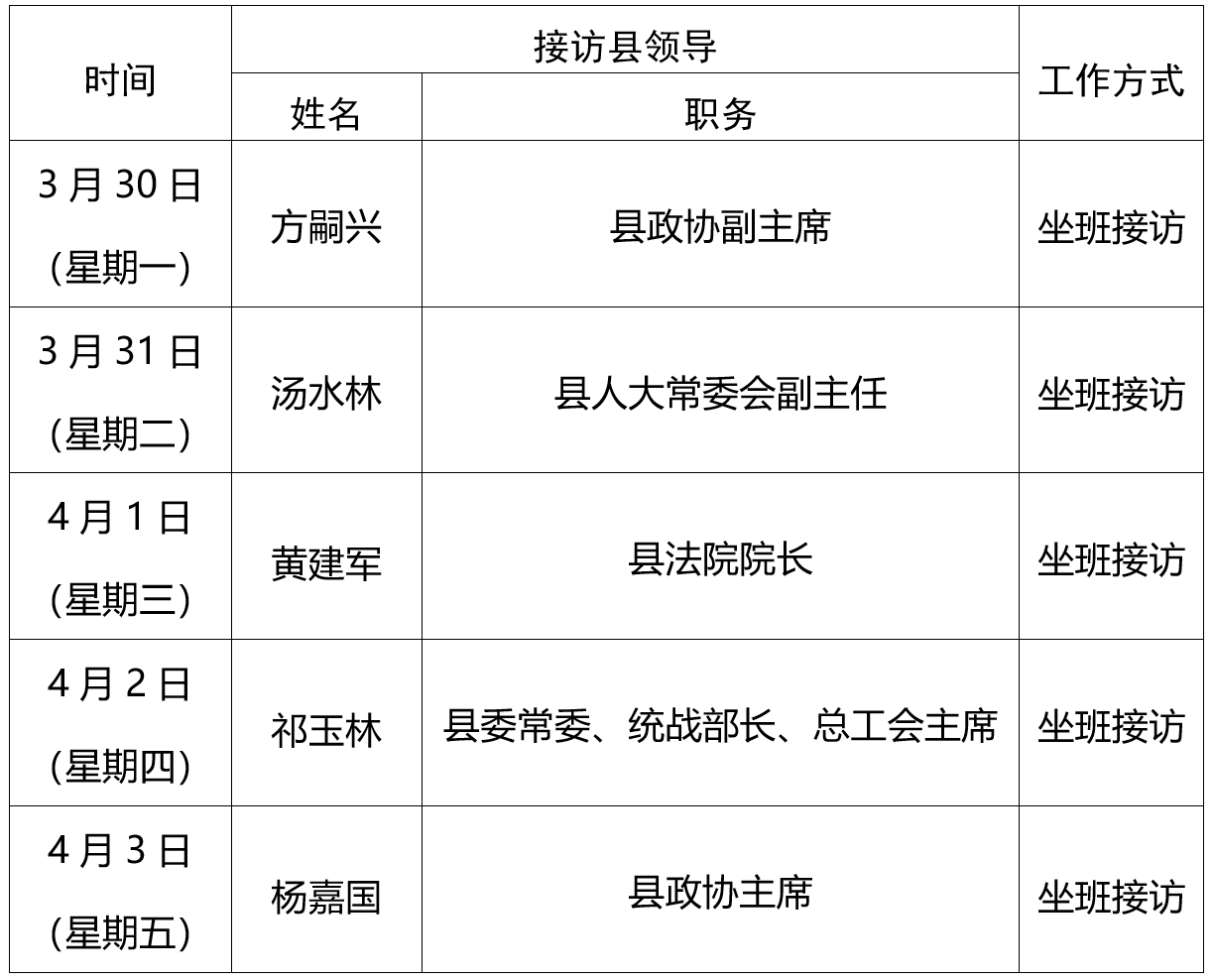 为深入践行党的群众路线,加强和改进人民信访工作,进一步畅通信访渠道,依法及时就地解决群众合理诉求,根据工作安排,现将浠水县2026年3月30日至4月3日县领导接访安排公示如下: