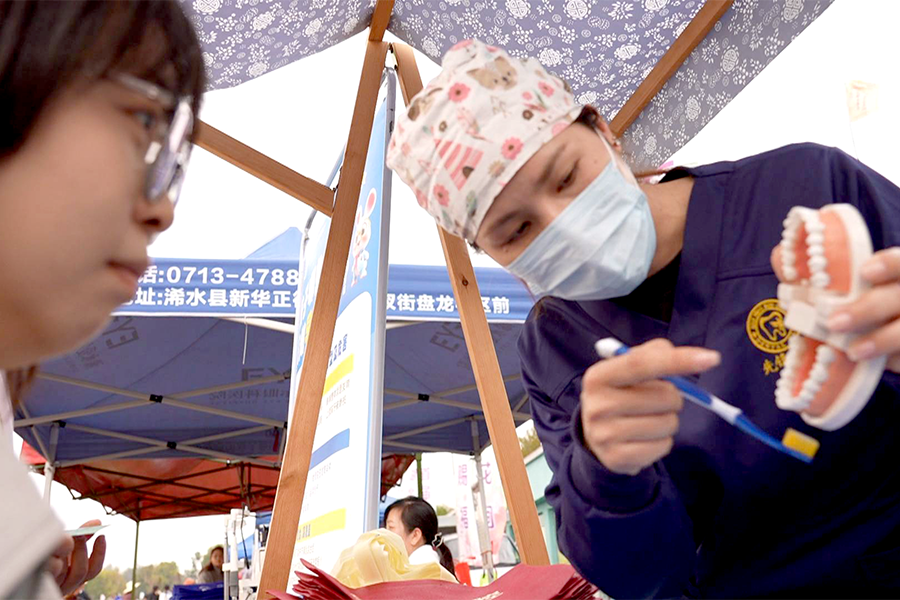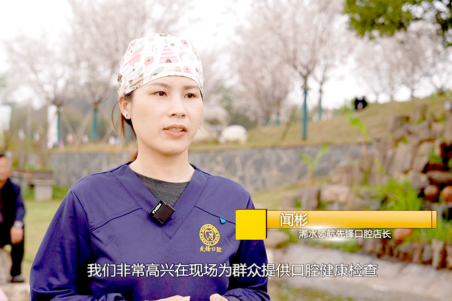 浠水领航先锋口腔店长 闻彬:今天作为志愿者参加花涧谷的"六进六送"活动,正好世界口腔健康日也在这个月,我们非常高兴在现场为群众提供口腔健康检查,希望我们的志愿服务活动开展得越来越多,越来越好。