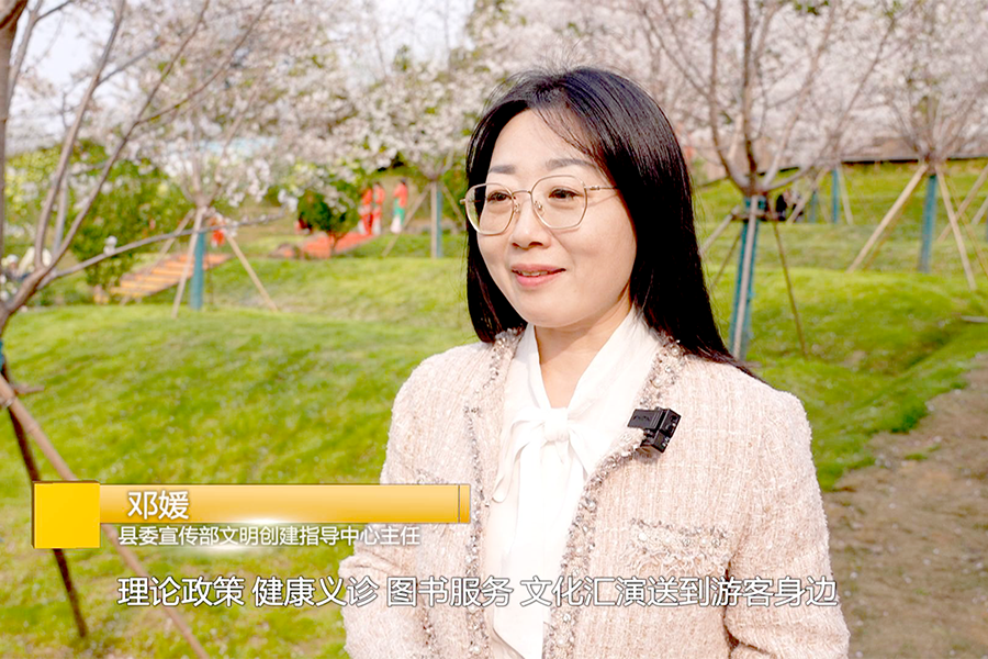 县委宣传部文明创建指导中心主任 邓媛:理论政策、健康义诊、图书服务、文化汇演送到游客身边。游客在赏花时也能亲身参与这些惠民服务,在游玩中感受文明,传递新风。