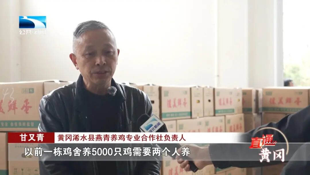 黄冈浠水县燕青养鸡专业合作社负责人 甘又青:以前一栋鸡舍养5000只鸡需要两个人养,现在3万只鸡只要一个人,解决了找工人难,对防疫也有好处。