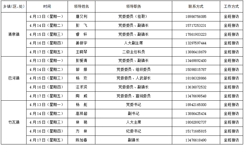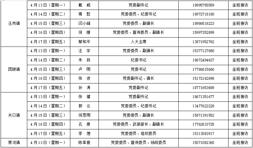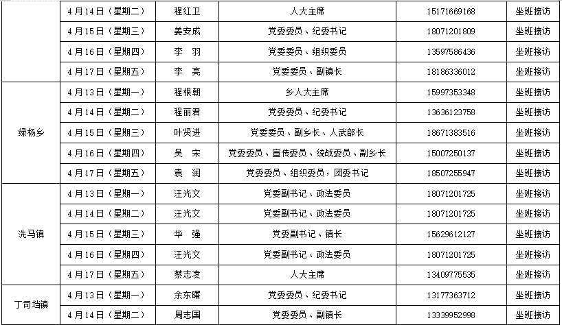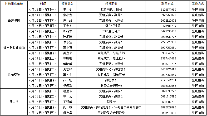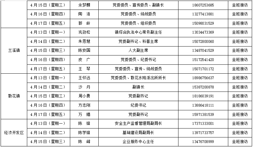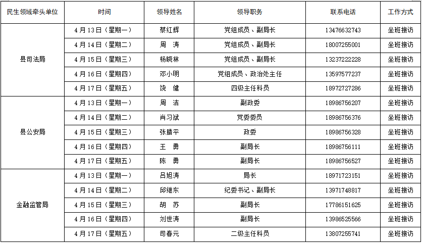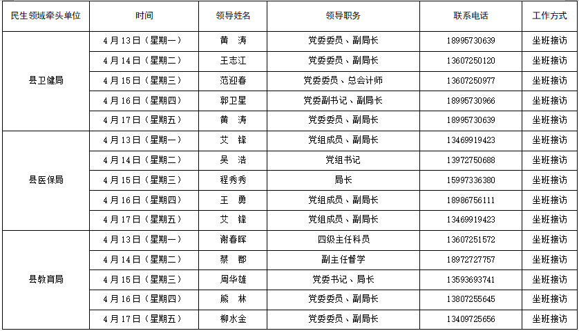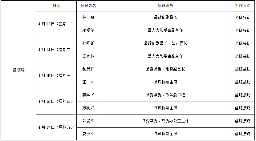 为进一步践行党的群众路线,加强和改进人民信访工作,进一步畅通信访渠道,倾听群众意见,依法及时解决群众合理诉求,根据工作安排,现将浠水县本周2026年4月13日至2026年4月17日领导接访安排公示如下: