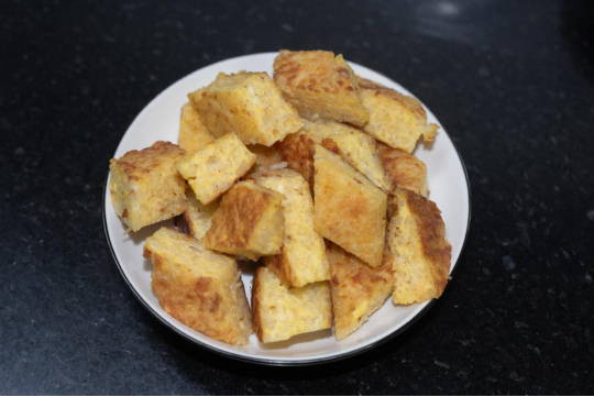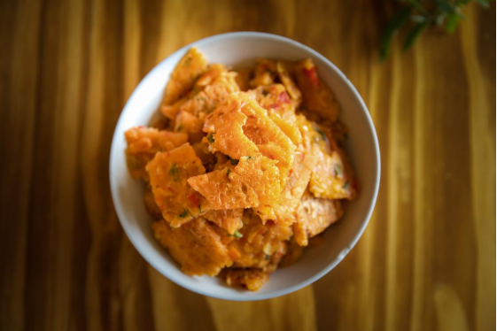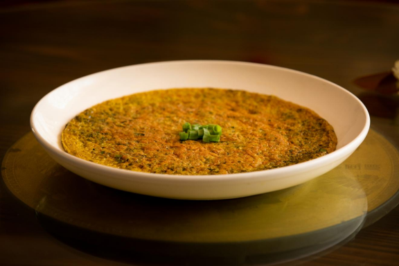 米粉加入秘制辣椒酱,加水拌成糊状,下锅煎成饼状,烙至两面金黄铲出,切块装盘,即可食用,也可做配菜。本菜所用的辣椒酱由青红辣椒混合制成,红绿点缀,如宝石镶嵌,咬上一口,天然谷香混上辣椒的香气,清香酥脆,香辣宜人。