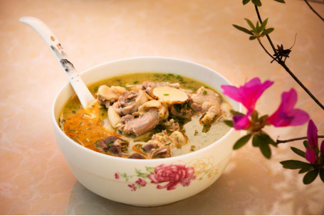 本道菜品是绿杨传统药膳,选用农家散养土鸡,从山上采挖野生黄精作为主要食材,用土罐文火炖3个小时以上,汤汁金黄浓郁,鲜甜可口,鸡肉筋道。