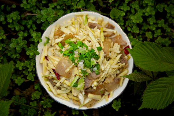 黄精是百合科黄精属的植物,为绿杨本土特产之一,其根茎被视为珍贵中药,自古以来就被用于防老抗衰、延年益寿。黄精性味甘甜,食用爽口,其肉质根状茎肥厚,含有大量淀粉、糖分、脂肪、蛋白质、胡萝卜素、维生素和多种其他营养成分,生食、炖服既能充饥,又有健身之用,可令人气力倍增、肌肉充盈、骨髓坚强,对身体十分有益。