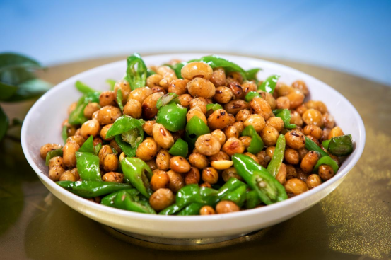 将土辣椒洗净切块,用猛火炒熟待用,再将黄豆用慢火干炒去生,加少许油慢火炒熟,加水焖煮,最后加入辣椒继续翻炒几下,即可出锅。本道菜品大豆金黄,粒粒圆满,焦香酥脆,配以青椒,黄绿相间,既是美食,更兼美色。